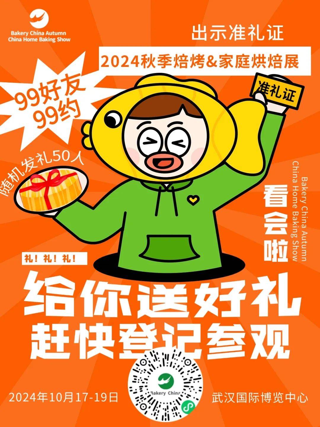 *自2024年9月3日起成功完成“2024第9届中国国际焙烤秋季展&2024第7届中国家庭烘焙用品展”预登记参观的观众,主办方将从上周预登记观众中随机抽取50名中奖观众。中奖观众将获得Bakery China送出的礼遇奖品1份。