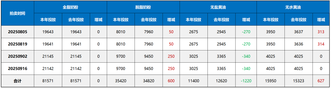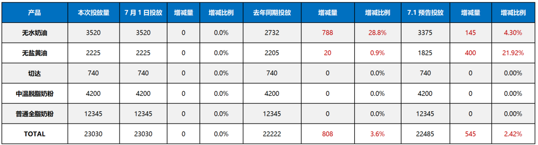 较7月1日的拍卖预告比较,无水微增,黄油继续大幅度增长。
