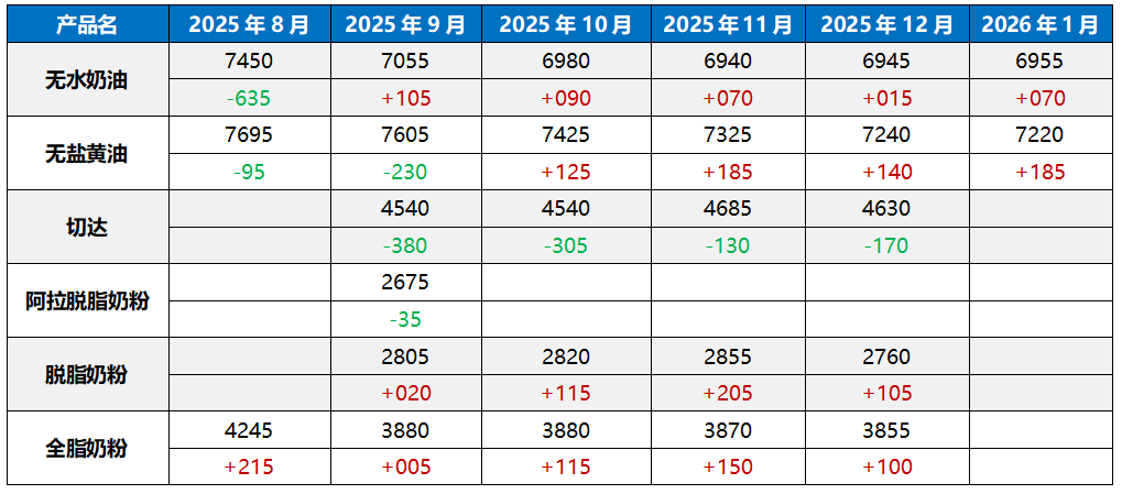 2025年8月- 2026年1月发货,投放总量同环比持平,其中同比小增,同比主要增量仍然来自于乳脂部分,拍前市场筑底迹象明显,各品种基本止跌,但观望气氛浓厚。本次拍卖东南亚客户整体表现较为活跃,总体小涨1.1%,成交24290吨,成交量环比小跌5%;参与户数大幅度上升,显示对旺季备货开始。