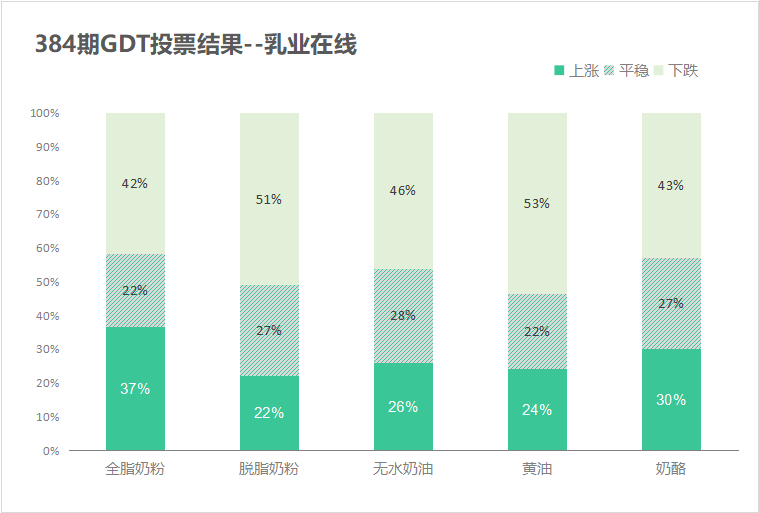 在7月15日第384次拍卖盘前分析中,我们发出了关于全脂奶粉、脱脂奶粉、奶酪、黄油、无水奶油价格走势预测的投票。投票结果如下: