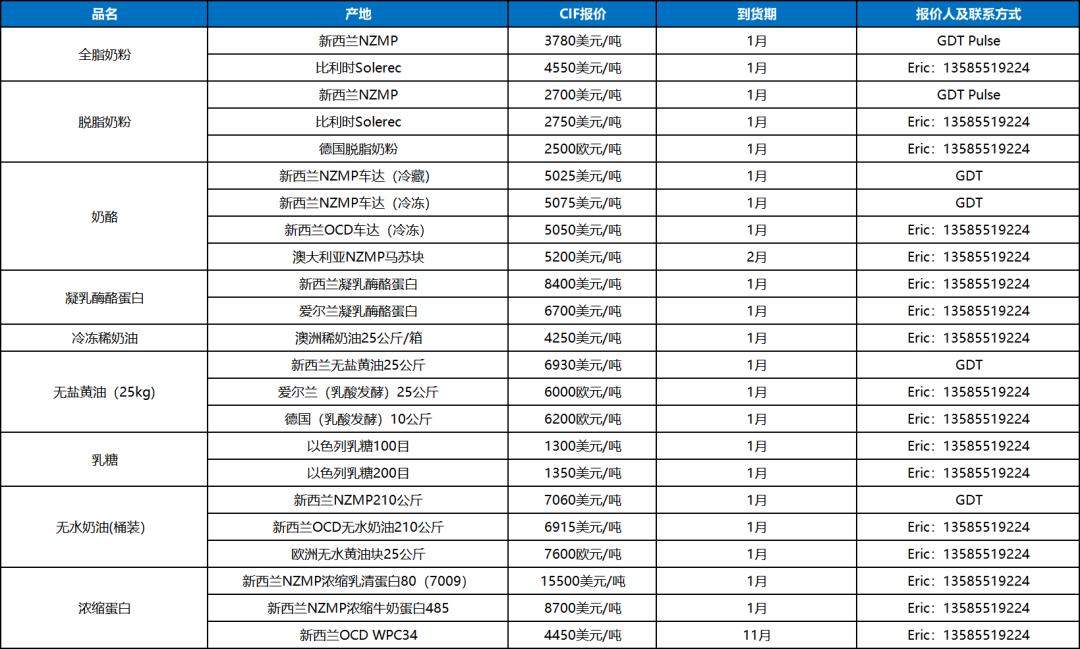 奶油芝士:奶油芝士进入销售旺季,新西兰主要品牌货源偏紧;澳洲奶油芝士仍时有抛盘流出,而由于澳洲本土奶源紧缺,预计新年后价格会有所上行。