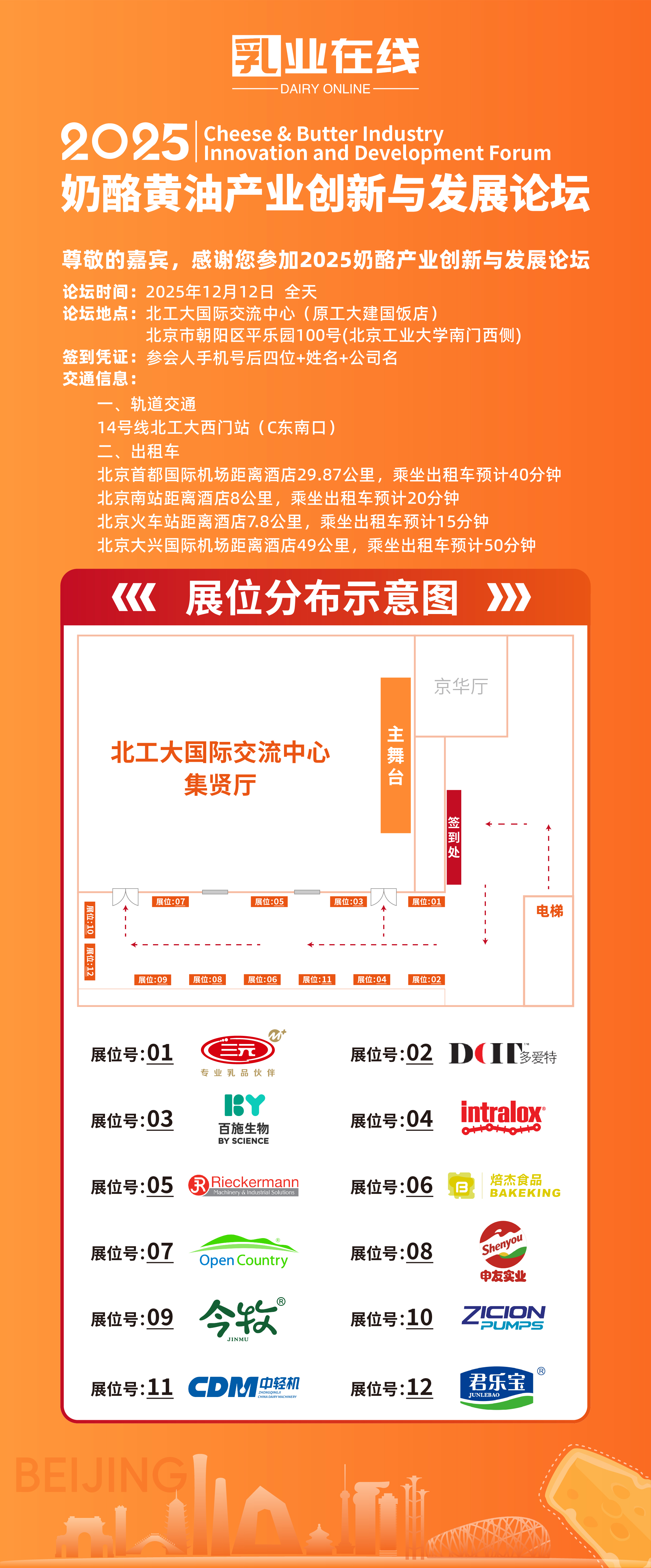 2025年12月12日,由乳业在线主办,北京市奶业协会、天津市奶业协会、河北省奶业协会、山东省奶业协会、内蒙古奶业协会、宁夏奶产业协会、中国物流与采购联合会冷链专业委员会、中国副食流通协会食育与健康产业分会协办的 “2025奶酪黄油产业创新与发展论坛”即将在北京召开。论坛汇聚了产业链上下游企业、专家学者与行业精英,围绕市场现状、技术创新、应用拓展、全球视野四大维度展开深度研讨。