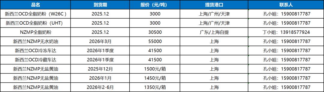 6. 新西兰主要厂家/产地动态:(1)新西兰主要厂家均在进行国内大客户拜访,意图锁定2026年部分出货;(2)新西兰全脂奶粉签约率低于预期,预计12月初北非招标将成为必争之地。