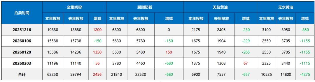 未来2月的4次拍卖,全脂奶粉持续增加,其它品种表面减少,但由于黄油将在2月份Pulse上线,所以可以认为黄油的增加将是大概率事件,而无水奶油目前看减少为主。