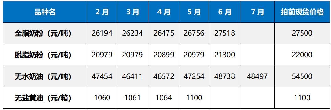 2.黄油:本轮跌幅低于预期,和欧美近期市场反弹有关,但国内现货仍然较多,需求也难以支撑巨量库存,少量进场,不宜重仓。3.切达奶酪:继续保持稳健表现,本产季整体供应受限,各区域买家轮番上阵,后期仍然可以持续购买。4.脱脂奶粉:受全脂奶粉大跌拖累,但该品种下行空间不大,主力到货期进入消费旺季,可开始建仓。5.全脂奶粉:外盘不配合下,再次大跌,但本轮价格已经跌破刚发布的奶价底线,考虑到已经进入国产奶粉报价区域,建议逐步进场。